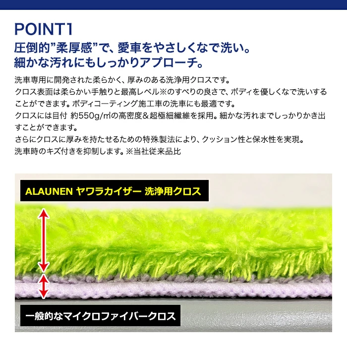 さらにクロスに厚みを持たせるための特殊製法により、クッション性と保水性を実現。洗車時のキズ付きを抑制します。