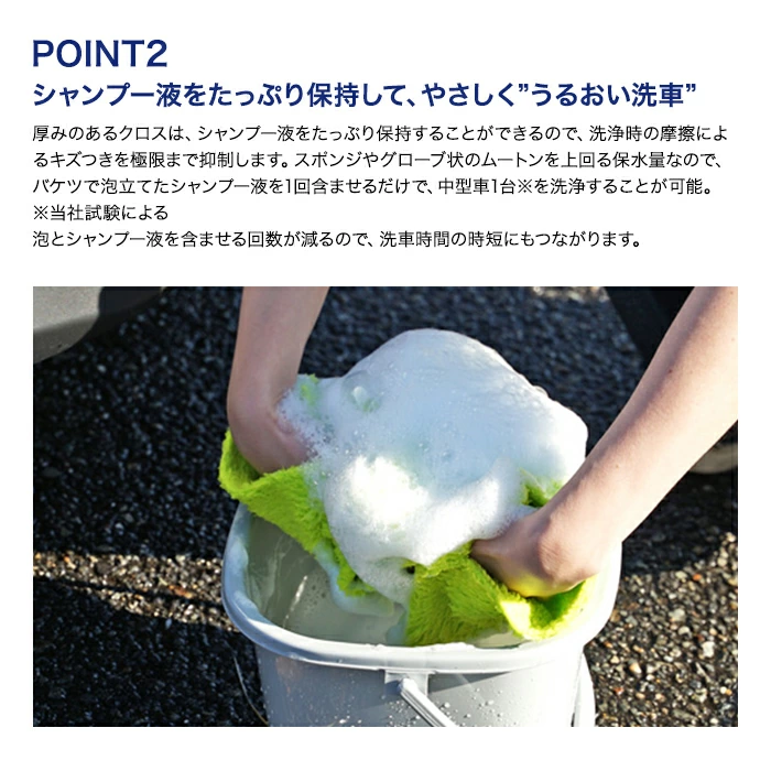 厚みのあるクロスは、シャンプー液をたっぷり保持することができるので、洗浄時の摩擦によるキズつきを極限まで抑制します。スポンジやグローブ状のムートンを上回る保水量なので、バケツで泡立てたシャンプー液を1回含ませるだけで、中型車1台※を洗浄することが可能。※当社試験による 泡とシャンプー液を含ませる回数が減るので、洗車時間の時短にもつながります。