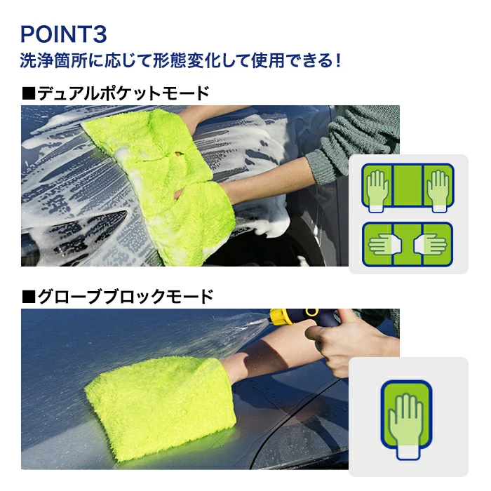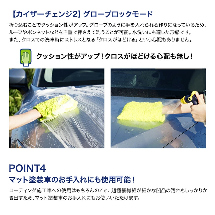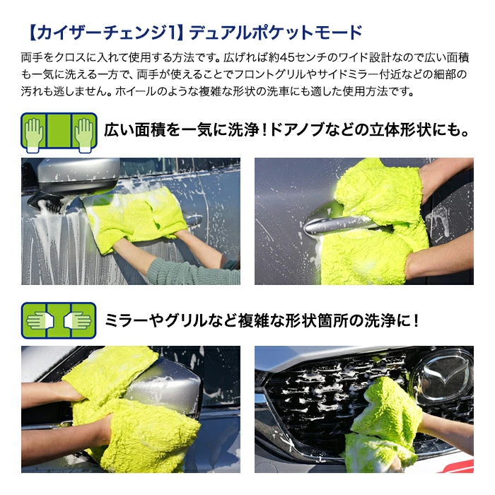 多彩な洗い方が楽しめる「カイザーチェンジ(変形機能)」を搭載。左右のポケットに手を入れれば、両手を使ってボンネットなど広い面をダイナミックでスピーディーに、また、複雑な形状もすっきり洗浄できます。ミルフィーユ状にクロスを重ねれば、クッション性がアップ、水洗いなど片手を空けて洗うこともできます。